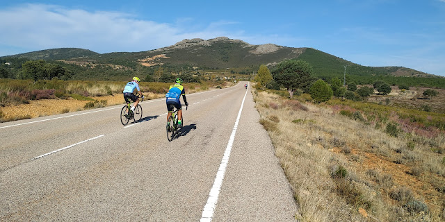 Mañana muy agradable, carreteras con firme excelente y tráfico escaso, componían un marco ideal para la practica del ciclismo. Y si le añades la buena compañía...ni te cuento. El amigo Sabu disfrutando del entorno, con el Cerro del Castillar (1379 m) al fondo: